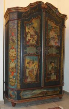 Weichholz gefasst, partiell marmoriert, in den Füllungen allegorische Darstellung der 4 Jahreszeiten, fie Fassung und Malerei sekundär, nicht zerlegbar, Höhe 185cm, Breite 124cm, Tiefe 60cm