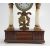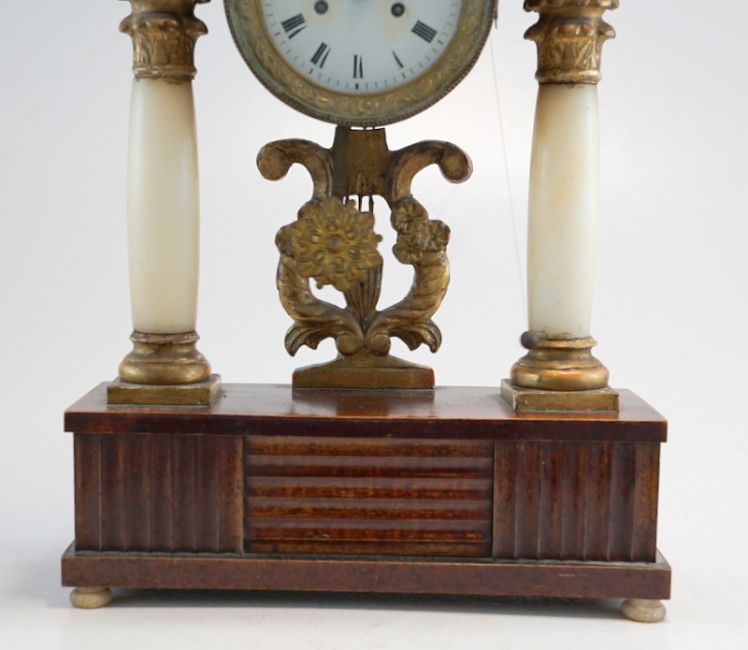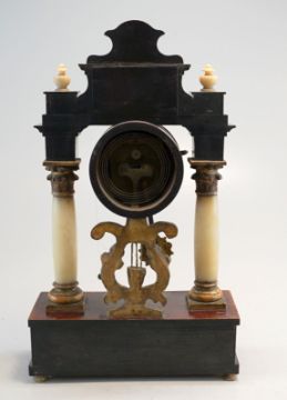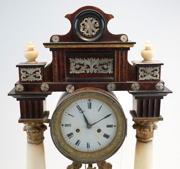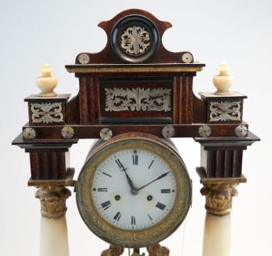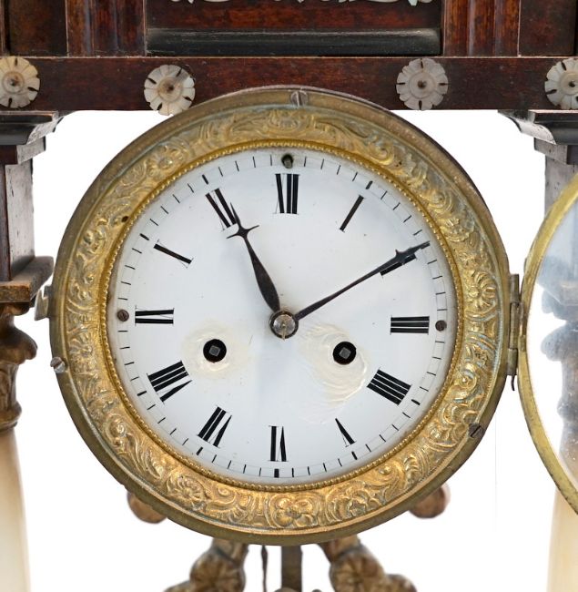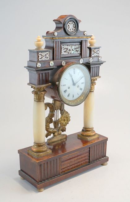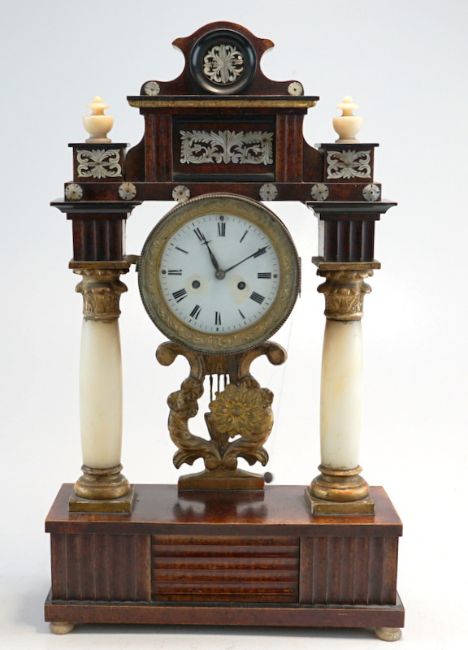 Nussbaum-Gehäuse auf 2 konischen Säulen, partiell gebeizt u. Ölvergoldung. Teil ebonisiert, aufgelegte Perlmutterschnitzereien. Emaillezifferblatt m. arab. Ziffern, originales Tagewerk mit Halbstundenschlag auf Tonfeder, Repetition und Fadenaufhängung - Sonnenpendel, Schnitzerei in Lyraform, funktionstüchtig, 53x35x12cm. Österreich ca. um 1820.