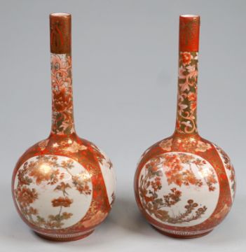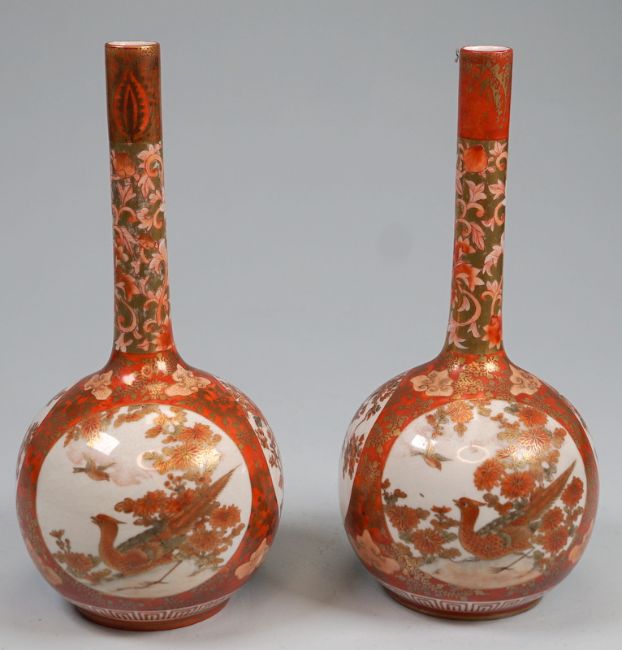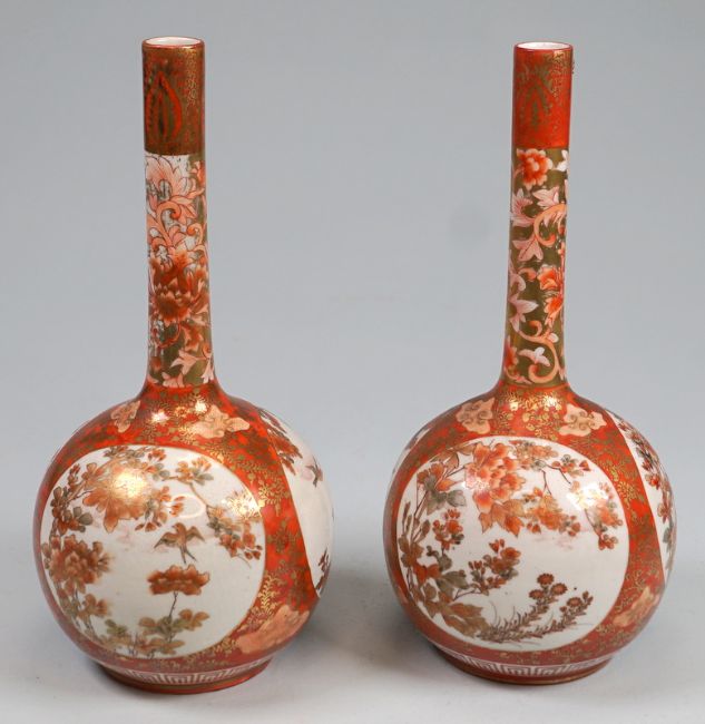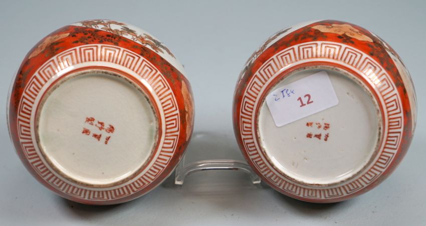 Pärchen Meiji Keulenvasen, signiert "Watano"Hergestellt von Watano - Kagaland 6 Zeichenmarke am Boden, Alterskraquelee in d. Glasur ohne Besch. Höhe 25cm, Bemalung in Eisenrot und Gold. Japan Meiji Epoche, 19. Jh. Pair of Meiji club vases, signed ‘Watano’Made by Watano - Kagaland 6 sign mark on the bottom, age craqueleur in the glaze without damage. Height 25cm, painted in iron red and gold. Japan Meiji era, 19th cent.