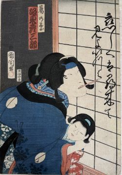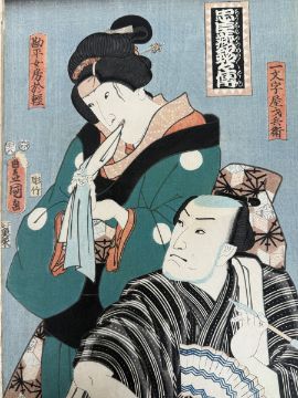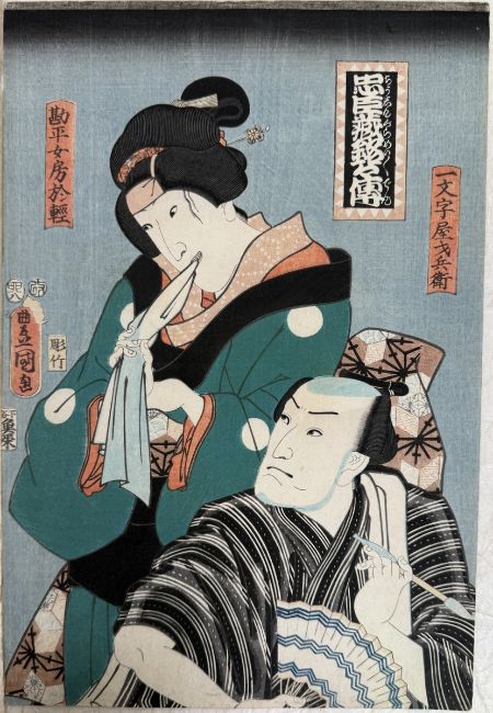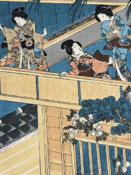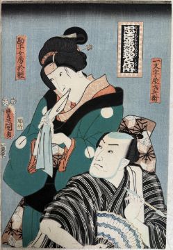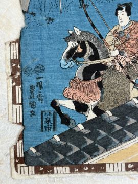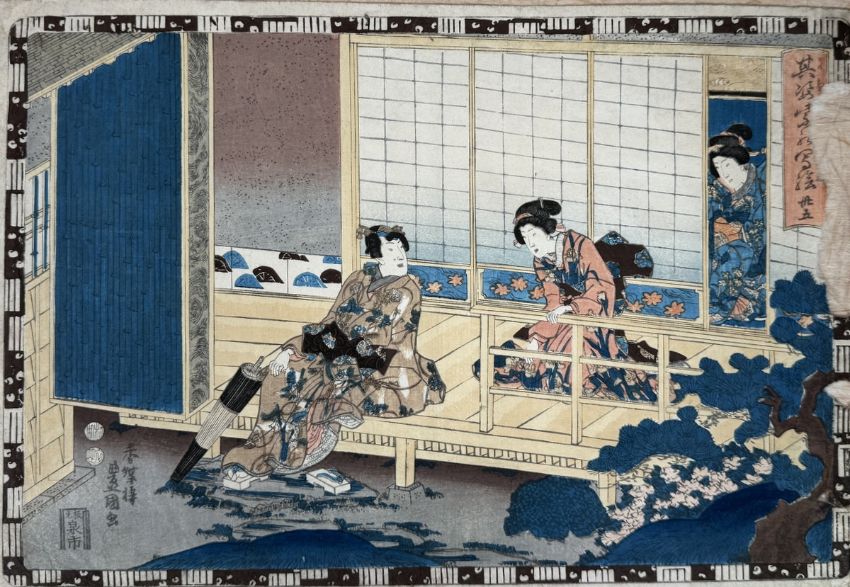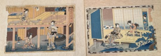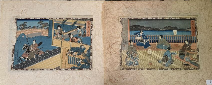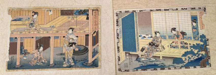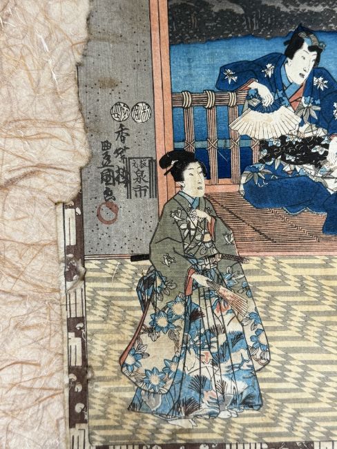 Farbholzschnitte auf Japanpapier, ca.25x36cm, bei 3 St. linker Rand beschädigt (Stück fehlt), bei 1 rechter Rand beschädigt (Stück fehlt), 2x Porträtdarstellung. Sowie ein Farbholzschnitt mit der Darstellung von Ashinaga und Tenaga, 34,5x25,5cm. Insg. 7 St.